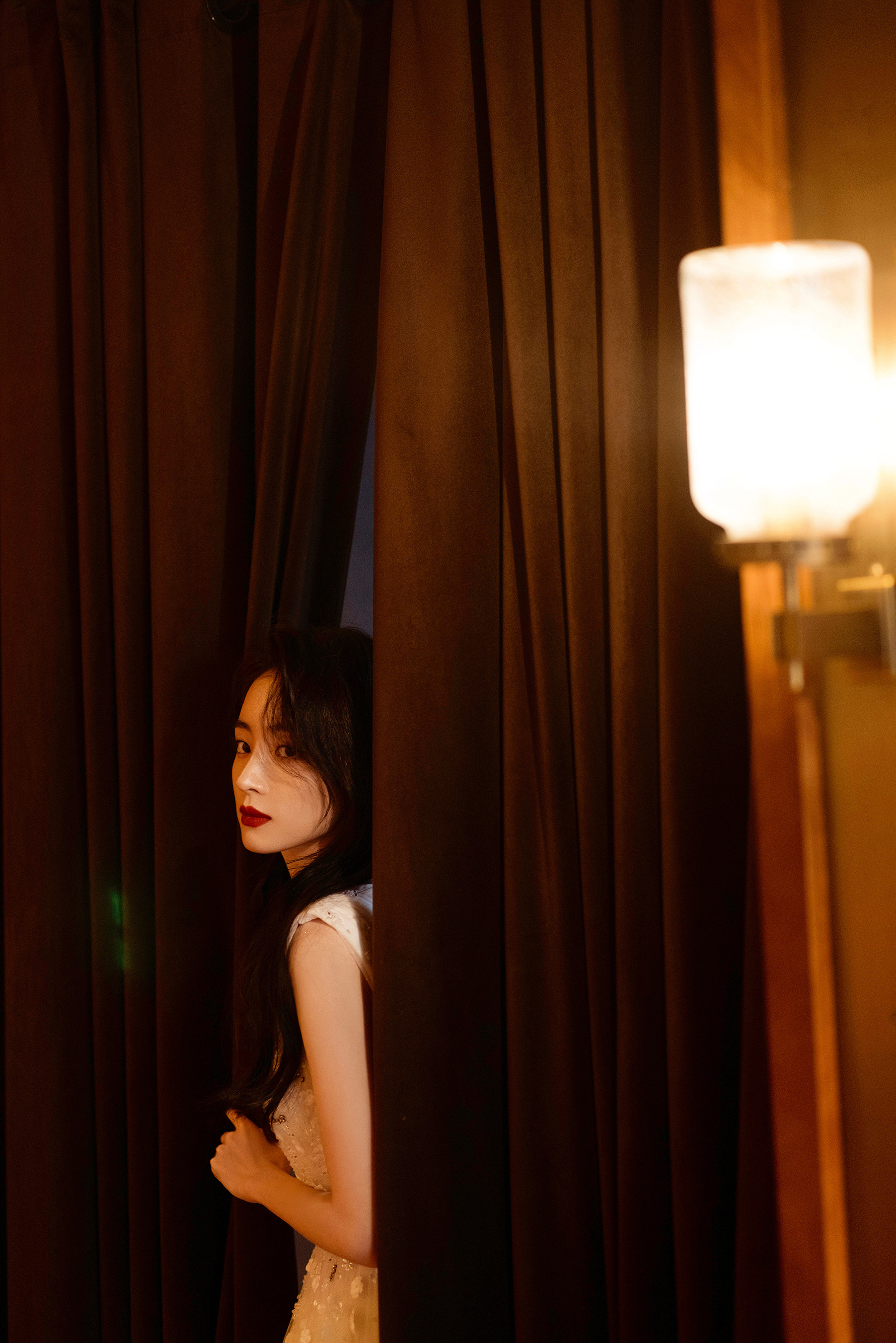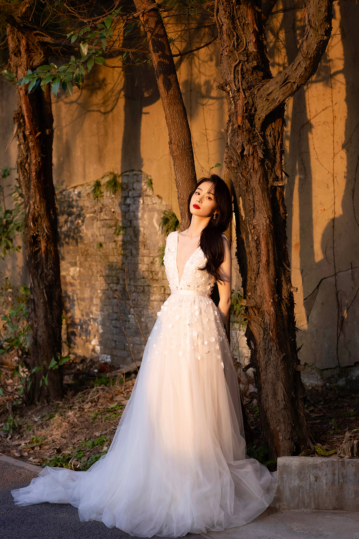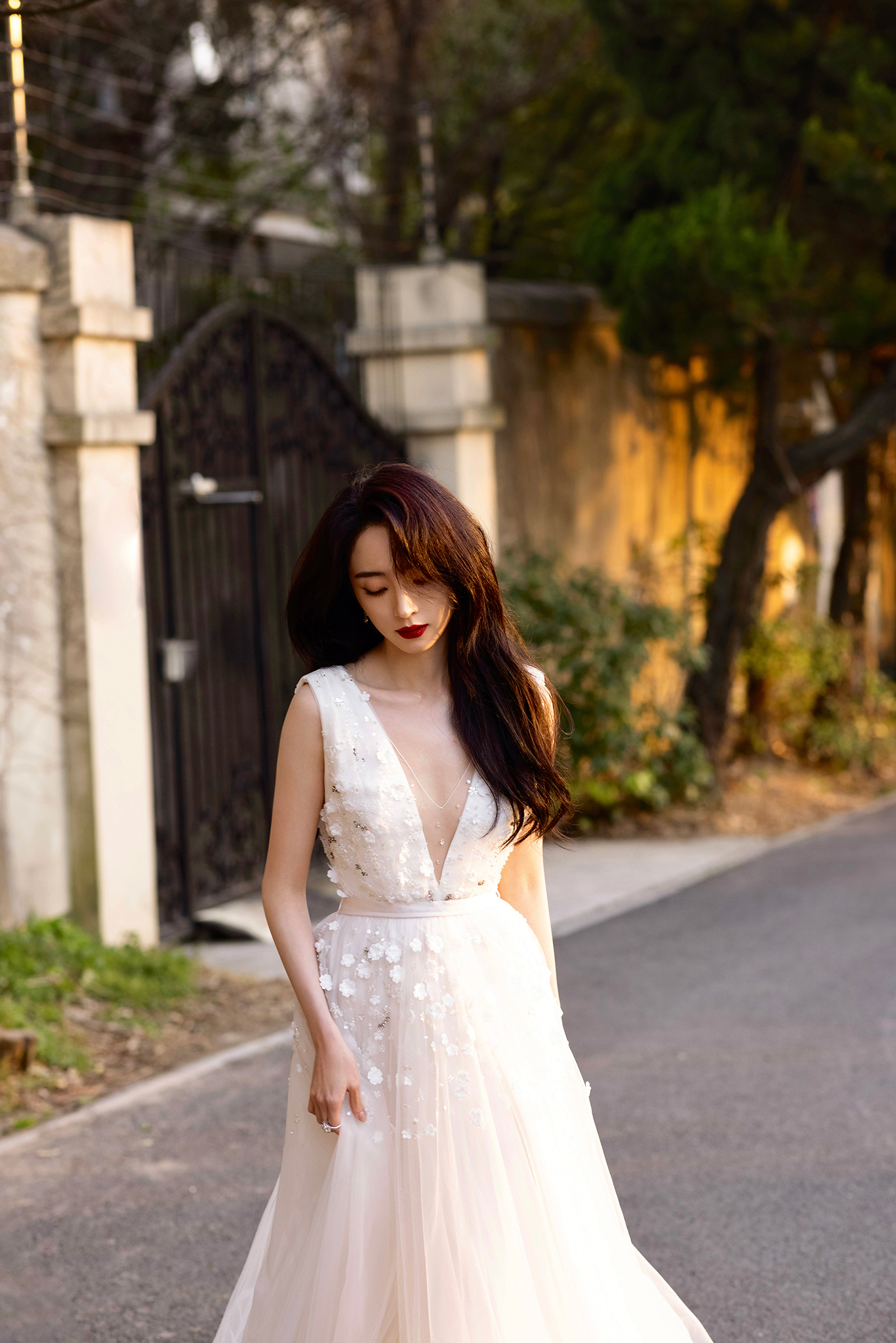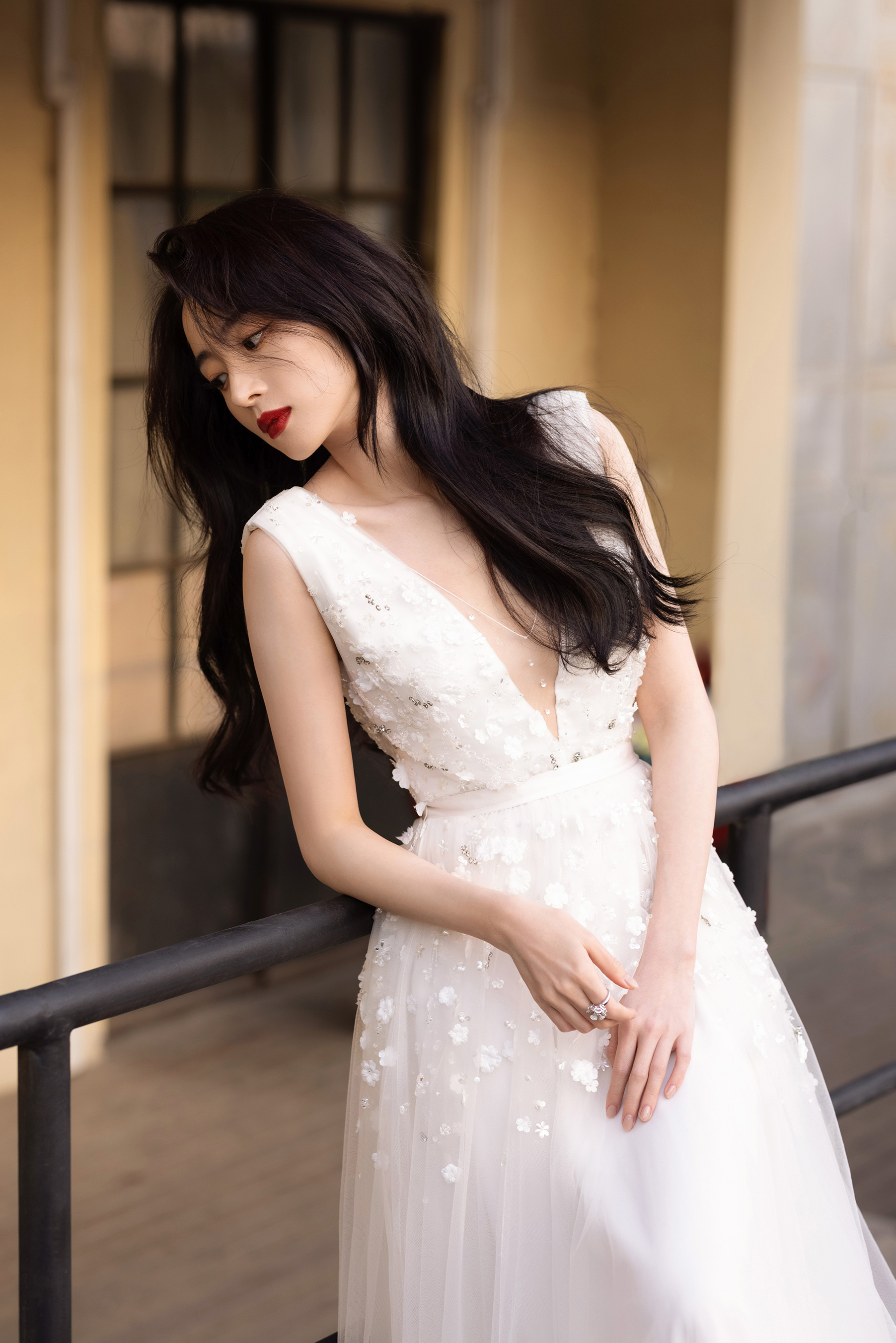 白色深V長裙,碎花裝點腰間,性感與溫柔的完美融合。復古紅唇卷發,清冷御姐氣場全開,浪漫又優雅令人過目不忘。